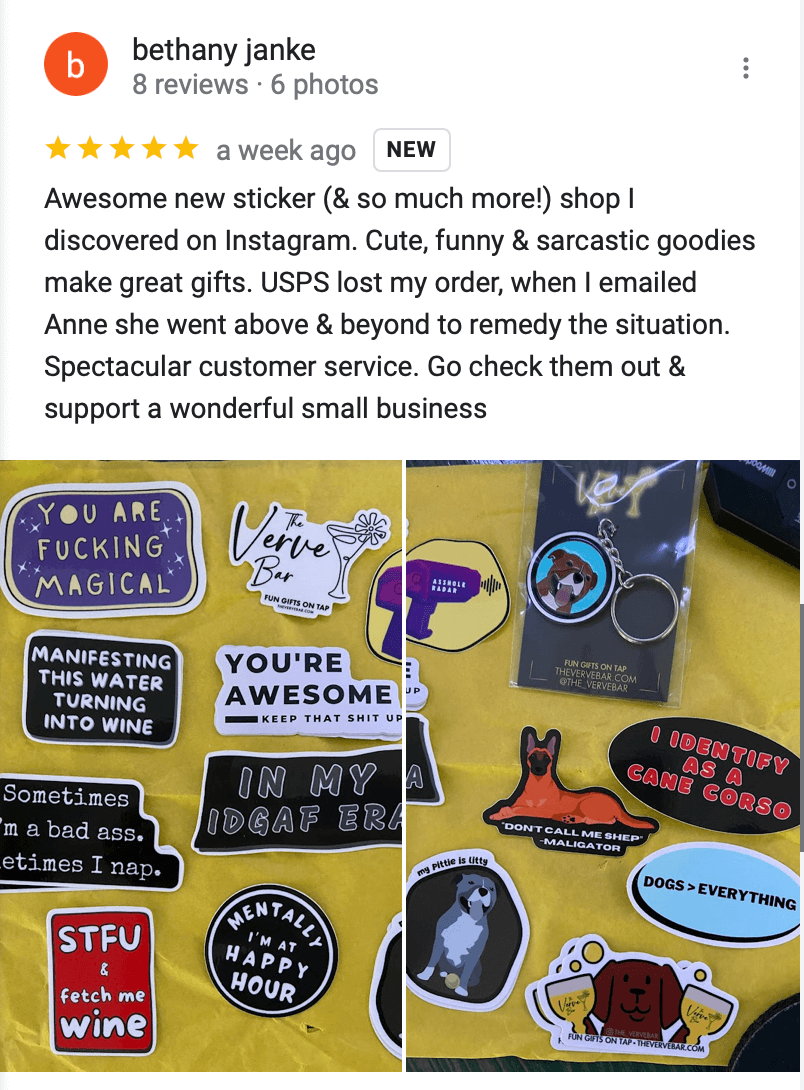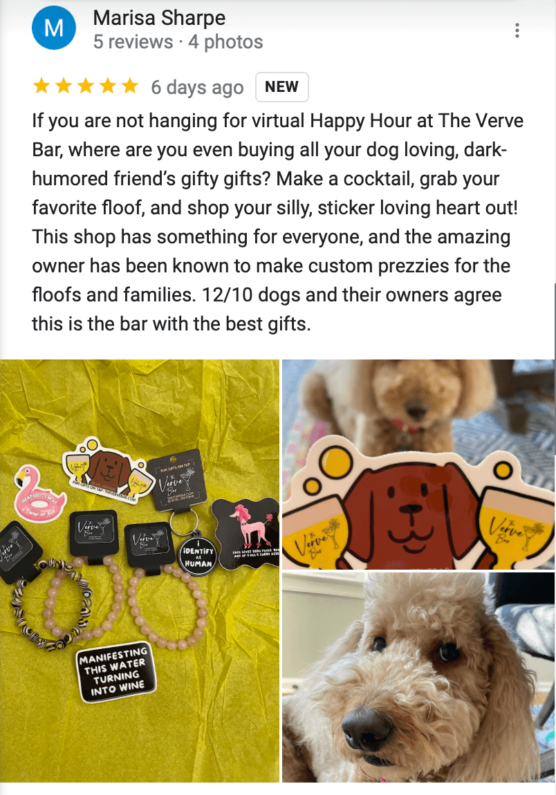 ⭐⭐⭐⭐⭐ I’m counting the days until The Verve Bar opens for wholesale orders. We received a few sample products and they are exactly what we’ve been looking for. Our dog-loving customers are going to go crazy over the stickers, dog accessories, and luggage tags! - Elena