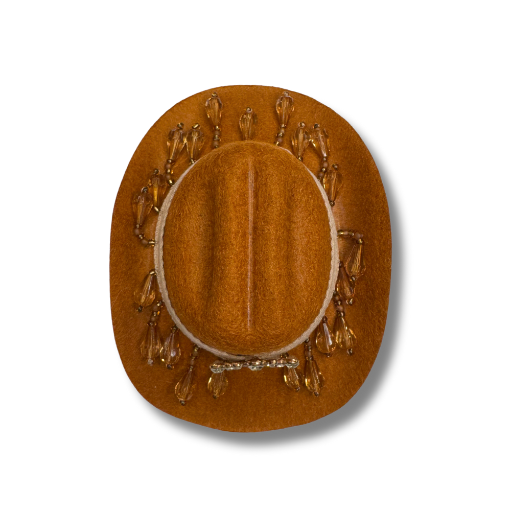 Tiny brown dog cowboy hat with some bling on it, amber beads and a rhinestone crown accent.