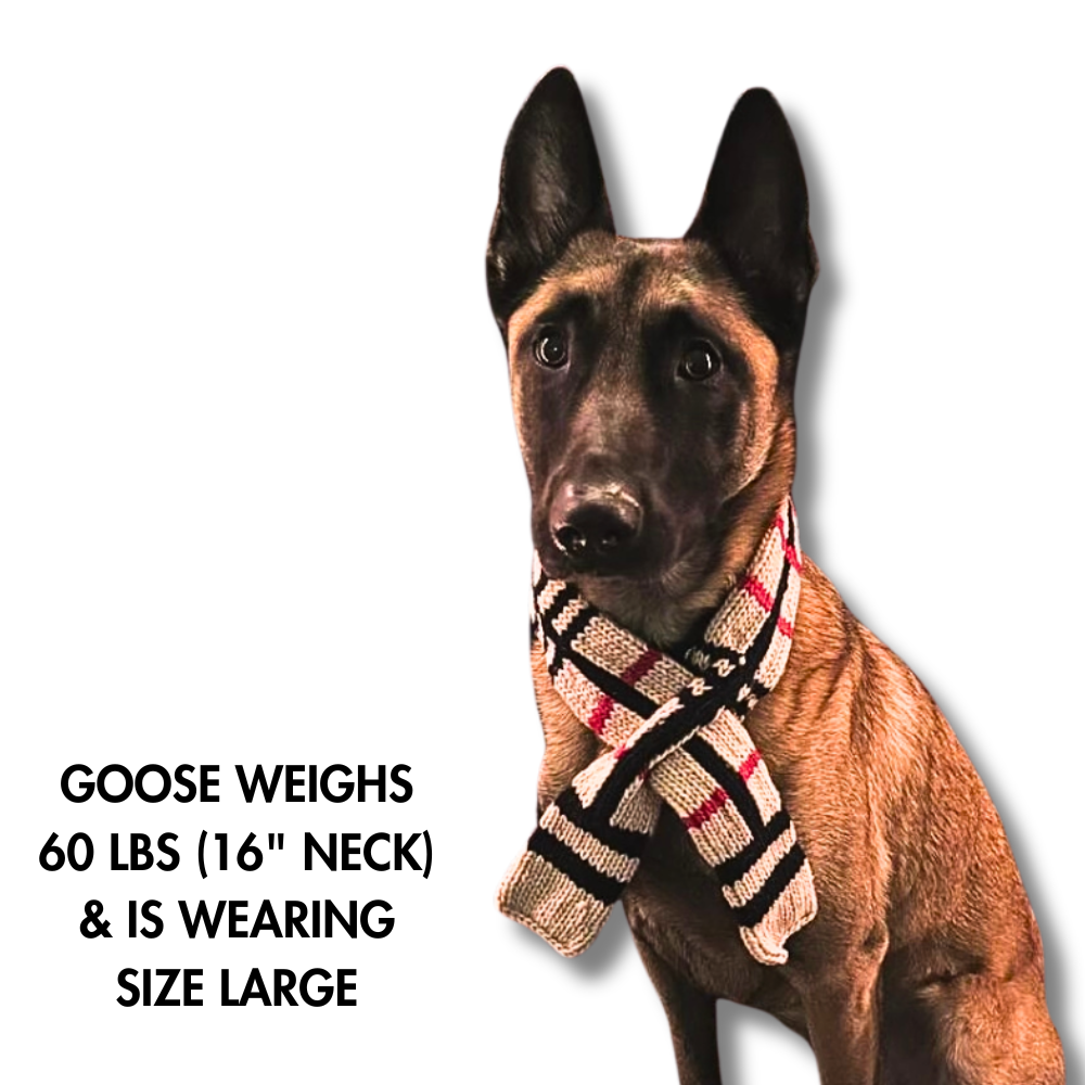 This gorgeous tan, red, white, and black tartan scarf for dogs is a showstopper and is available in 3 sizes for all dog breeds!