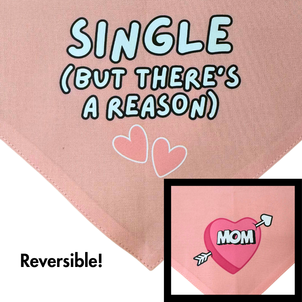 REVERSIBLE pink dog bandana with "MOM" in a heart on the front and "For a good time, follow me on Insta" on the reverse.